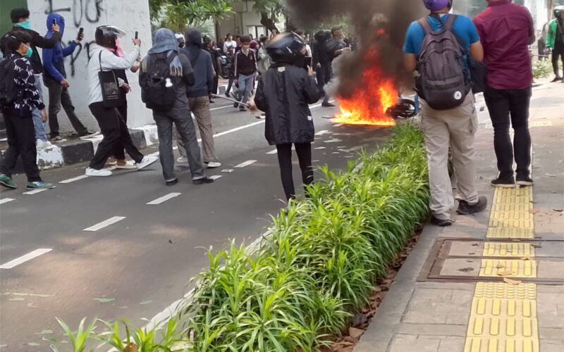 Sayangnya ditengah aksi, terjadi kerusuhan akibat massa terpancing emosinya. Satu motor Vario yang terparkir di pintu keluar DPR RI dirusak massa dan bahkan dibakar.