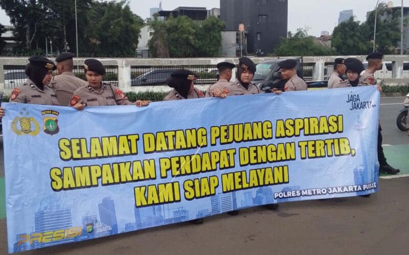 Dalam aksi ini juga ditemui polwan dari Polresta Metro Jakarta Pusat membagikan roti dan air mineral pada orang-orang yang hadir di lokasi aksi. Selain itu mereka juga membentangkan spanduk bertuliskan,”Selamat Datang Pejuang Aspirasi. Sampaikan Pendapat dengan Tertib. Kami Siap Melayani.”. (Don).