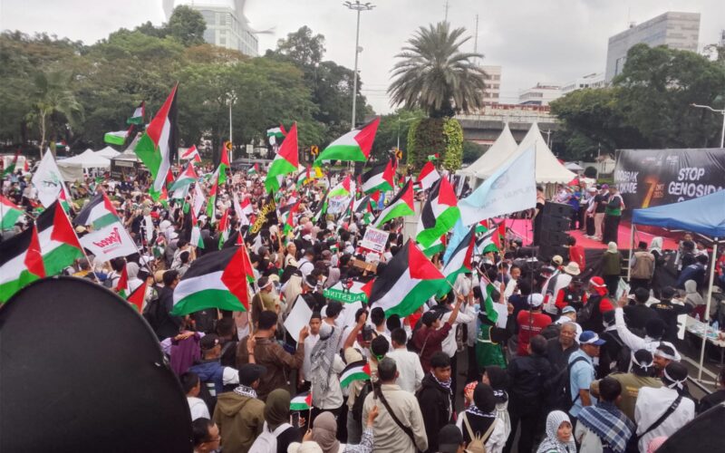 Jalan Merdeka Selatan yang semula lancar berubah menjadi penutupan jalan dua jalur di depan Gedung Pemprov DKI Jakarta dan Gedung Kedutaan Besar Amerika Serikat. Massa berteriak-teriak “Free Free Palestine!” sambil mengacungkan tangan kanan keatas. (Don).