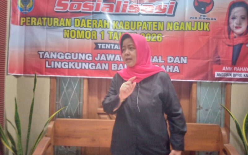 Nganjuk, vokalpublika.com— Anggota DPRD Kabupaten Nganjuk dari Fraksi PDI Perjuangan, Anik Rahayu, S.E., menggelar kegiatan sosialisasi Peraturan Daerah Kabupaten Nganjuk Nomor 1 Tahun 2026 tentang Tanggung Jawab Sosial dan Lingkungan (TJSL) Badan Usaha kepada masyarakat.