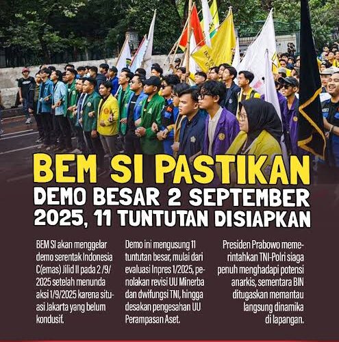 Jakarta, Vokalpublika.com – Aliansi Badan Eksekutif Mahasiswa Seluruh Indonesia (BEM SI) hari ini, Selasa 2 September 2025, akan menggelar aksi di Jakarta.