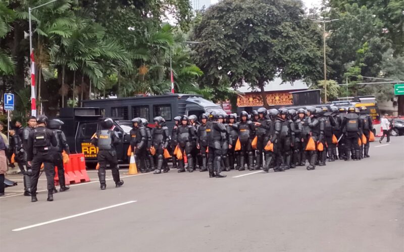 Polda Metro Jaya menyiapkan personel pengamanan aksi yang disiagakan dekat kantor Kapolda Metro Jaya. Terlihat 4 kompi pasukan berbaris menunggu perintah untuk pengamanan aksi.