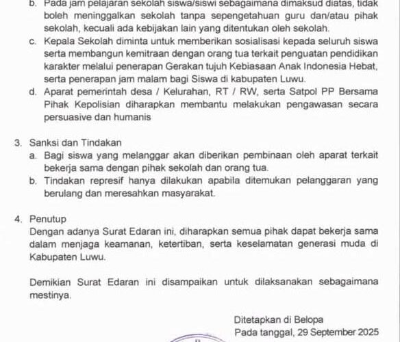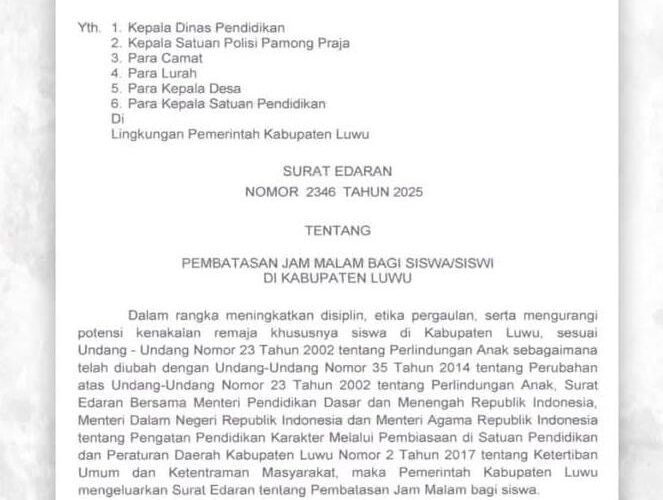 Bupati Luwu, vokalpublika.com – H. Patahudding, resmi menerbitkan Surat Edaran Nomor 2346 Tahun 2025 tentang Pembatasan Jam Malam Bagi Siswa/Siswi di Kabupaten Luwu.