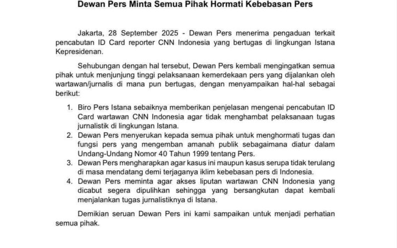 Jakarta, Vokalpublika.com – Dewan Pers menyampaikan pernyataan resmi terkait pengaduan pencabutan ID Card wartawan CNN Indonesia yang bertugas di lingkungan Istana Kepresidenan. Dalam sikap resminya yang dirilis pada 28 September 2025, Dewan Pers menegaskan pentingnya penghormatan terhadap kebebasan pers dan mendesak agar kasus serupa tidak terulang di kemudian hari.
