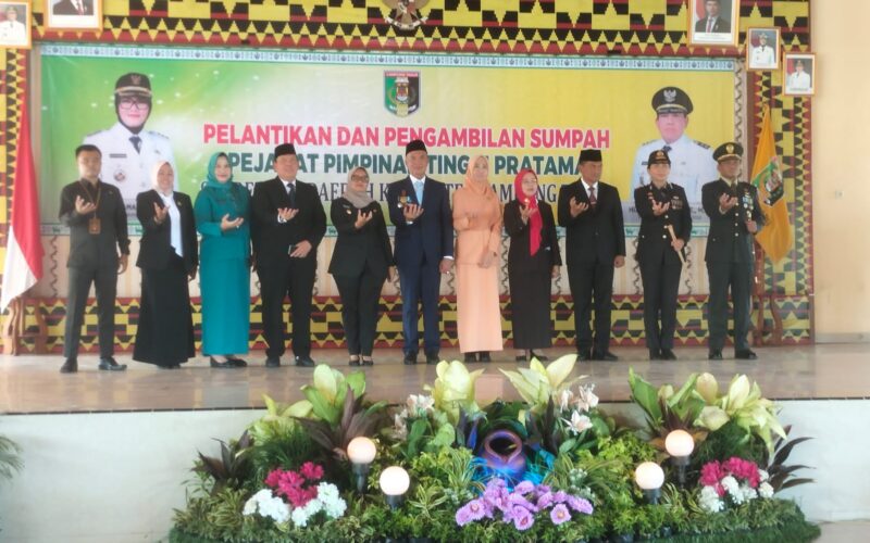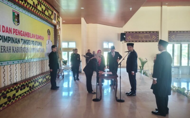 Pelantikan dan pengambilan sumpah jabatan pejabat pimpinan tinggi pratama Sekda Lampung Timur berlangsung khidmat di Gedung Rumah Dinas Bupati Lampung Timur.