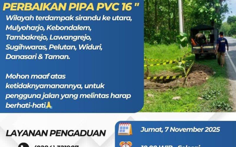Pemalang, Vokalpublika.com – Informasi sekaligus himbauan kepada pelanggan untuk bersiap menampung persediaan air bersih. Perusahaan Umum Daerah (Perumda) Air Minum Tirta Mulia mengumumkan adanya perbaikan kebocoran pipa, tentu akan terjadi gangguan distribusi air bersih yang signifikan mulai hari ini, Jumat (7/11/2025).
