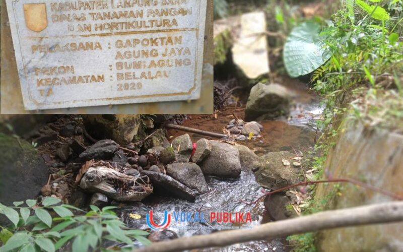 Saluran irigasi yang dibangun pada tahun 2020 melalui program ketahanan pangan dan hortikultura oleh Gapoktan Agung Jaya di Pekon Bumi Agung, kini mengalami kerusakan parah. Irigasi tersebut hancur akibat tergerus aliran sungai di wilayah setempat, menyebabkan pasokan air ke area persawahan terganggu dan berujung pada ancaman gagal tanam.