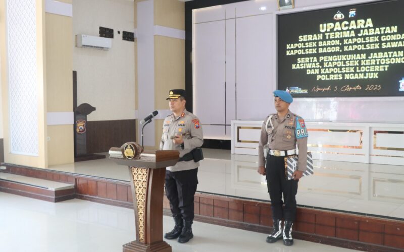 Nganjuk, Vokalpublika.com– Kepolisian Resor Nganjuk menggelar upacara Serah Terima Jabatan (Sertijab) Kapolsek Baron, Gondang, Bagor, dan Sawahan, serta pengukuhan jabatan Kasiwas, Kapolsek Kertosono, dan Kapolsek Loceret. Kegiatan ini dipimpin langsung oleh Kapolres Nganjuk, AKBP Henri Noveri Santoso, S.H., S.I.K., M.M., di halaman Mapolres Nganjuk, Selasa (5/8/2025).