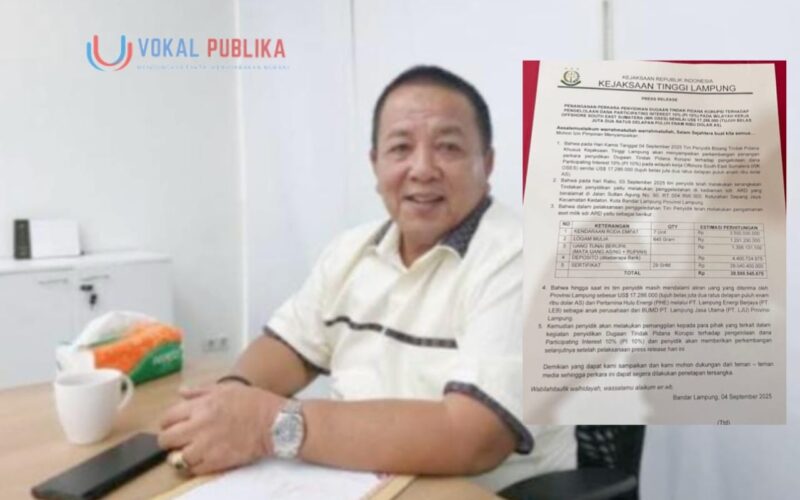 Bandar Lampung, vokalpublika.com – Hari ini, Kamis 4 September 2025, Kejaksaan Tinggi (Kejati) Lampung melakukan penggeledahan di kediaman mantan Gubernur Lampung, Arinal Djunaidi, yang berlokasi di Jalan Sultan Agung, Bandar Lampung. Aksi penyidik ini menyorot dugaan korupsi pengelolaan dana Participating Interest (PI) 10% senilai US$17,28 juta atau sekitar Rp271 miliar di PT Lampung Energi Berjaya (LEB).