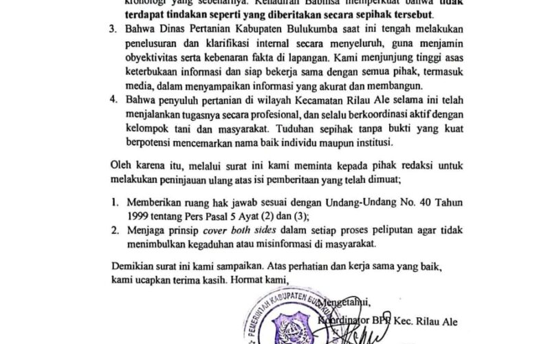 Menanggapi informasi yang beredar, pihak Balai Penyuluh Pertanian (BPP) Rilau Ale sebagai instansi tempat oknum penyuluh bertugas, segera mengambil langkah dengan menerbitkan surat klarifikasi resmi. Dalam surat tersebut, BPP membantah narasi yang dimuat dalam pemberitaan beberapa media daring.