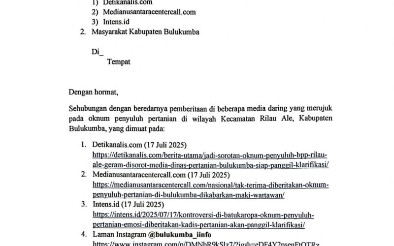 Bulukumba,Vokalpublika.Com -Dugaan kasus makian yang melibatkan seorang penyuluh pertanian di Desa Batu Karopa, Kecamatan Rilau Ale, Kabupaten Bulukumba, terus menjadi sorotan publik. Peristiwa ini mencuat ke permukaan setelah diberitakan oleh sejumlah media daring pada 17 Juli 2025. Dalam pemberitaan tersebut, penyuluh berinisial AF diduga telah melakukan makian terhadap seorang wartawan saat menjalankan tugas peliputan.
