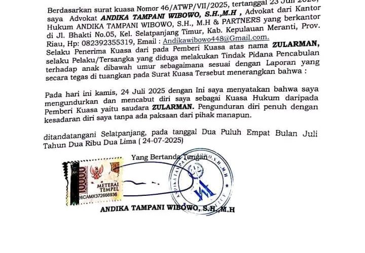 Saya menyatakan bahwa saya mengundurkan dan mencabut diri saya sebagai Kuasa Hukum dari pemberi kuasa yaitu saudara Zularman, yang diduga melakukan tindak pidana pencabulan terhadap anak di bawah umur,” tulis Andika dalam surat yang telah dibubuhi meterai dan ditandatangani secara resmi di Selatpanjang.