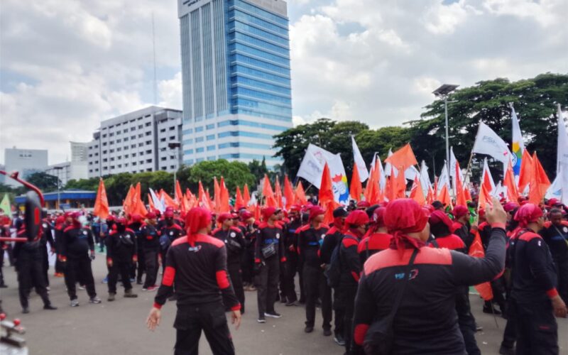 Massa bertambah dengan hadirnya massa buruh dari Tangerang, Bekasi dan Bogor.