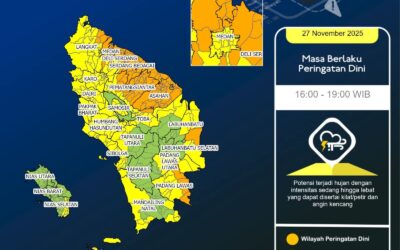 Medan/vokalpublika.comBadan Meteorologi, Klimatologi, dan Geofisika (BMKG) Sumatera Utara mengeluarkan Update Peringatan Dini Cuaca pada Kamis (27/11/2025) pukul 15.30 WIB. Dalam informasi tersebut, BMKG menyebutkan masih terdapat potensi hujan sedang hingga lebat yang dapat disertai kilat/petir dan angin kencang pada pukul 16.00 WIB di sejumlah kabupaten dan kota di Sumatera Utara. Wilayah yang berpotensi mengalami cuaca …
