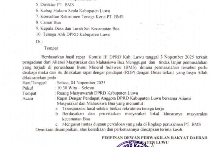 Hal tersebut DPRD Luwu mengeluarkan surat pemanggilan kepada pihak perusahaan dan pemerintah daerah yang terkait dengan ketenagakerjaan untuk duduk bersama dalam dengar pendapat (RDP),yang di jadwalkan akan berlangsung pada hari Selasa,4 November 2025.pada pukul: 10:30 Wita.