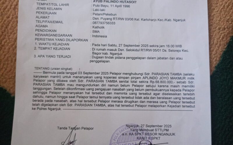Nganjuk, vokalpublika.com — Dunia koperasi di Kabupaten Nganjuk kembali tercoreng. Seorang karyawan aktif KSP Aplindo Joyo Makmur, Parasian Tamba, bersama istrinya Rasyah dan rekannya Wendi Siregar, resmi dilaporkan ke Polres Nganjuk atas dugaan tindak pidana penipuan dan penggelapan dana.