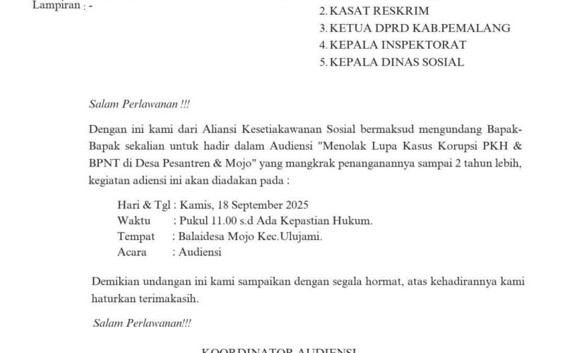 Pemalang, Jawa Tengah|Vocalpublika.com – Aliansi Kesetiakawanan Sosial (AKSI) bersama ratusan warga Desa Mojo dan Desa Pesantren bakal audensi terbuka terkait dugaan korupsi dana bantuan sosial BPNT dan PKH di kantor Desa Mojo, Kecamatan Ulujami, Kabupaten Pemalang, pada Kamis 18 September 2025 besok. Audensi terbuka untuk mendesak kasus dugaan korupsi dana bantuan sosial diusut tuntas, karena menurut mereka, kasus yang terjadi sejak dua tahun silam tak kunjung ada penyelesaian.