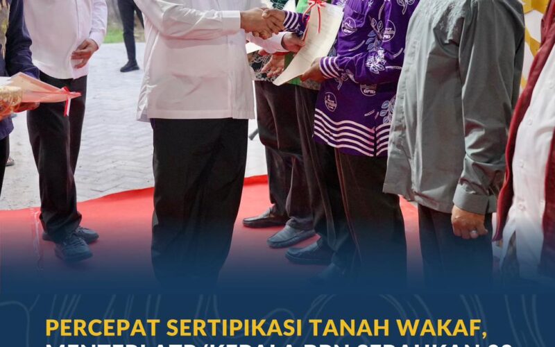 Komitmen pemerintah dalam memperkuat legalitas aset keagamaan kembali ditegaskan melalui percepatan sertipikasi tanah wakaf. Kementerian Agraria dan Tata Ruang/Badan Pertanahan Nasional (ATR/BPN) menyerahkan sebanyak 33 sertipikat tanah kepada pengelola rumah ibadah dan yayasan pendidikan keagamaan di Provinsi Sulawesi Tengah.