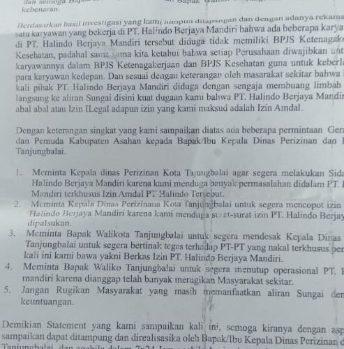 Gerakan Mahasiswa dan Pemuda Asahan mendesak Dinas Penanaman Modal dan Pelayanan Terpadu Satu Pintu (DPMPTSP) serta Wali Kota Tanjung Balai untuk segera meninjau ulang izin operasional perusahaan tersebut dan menindaklanjuti temuan-temuan yang meresahkan masyarakat.