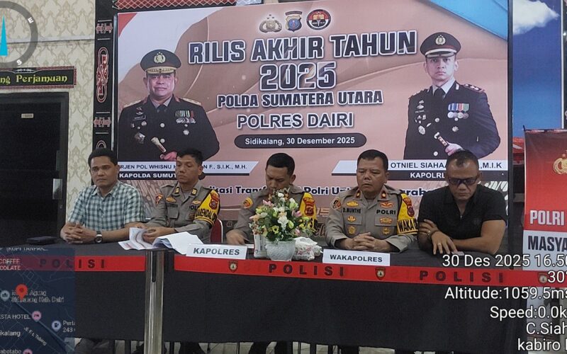 Kepolisian Resor (Polres) Dairi menggelar konferensi pers refleksi akhir tahun 2025 sebagai bentuk evaluasi kinerja sekaligus penyampaian informasi kepada publik. Kegiatan ini berlangsung di Ruang Lobi Polres Dairi, Selasa (30/12/2025).