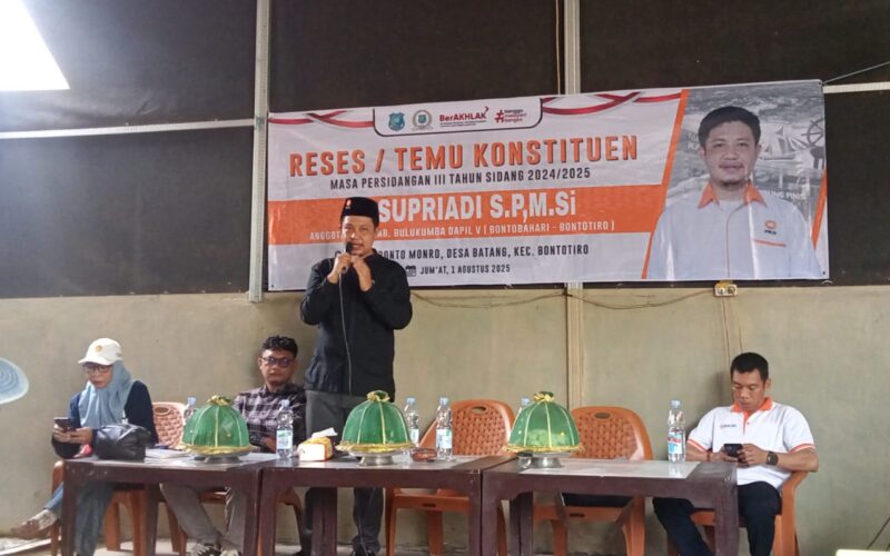 Bulukumba,Vokalpublika.com- Anggota DPRD Kabupaten Bulukumba, Dr. Supriadi, S.P., M.S.I., dari Fraksi Partai Keadilan Sejahtera (PKS), melaksanakan reses di daerah pemilihannya pada Jumat, 1 Agustus 2025. Kegiatan tersebut berlangsung di Desa Batang, Kecamatan Bontotiro dan dihadiri oleh Camat Bontotiro, perwakilan Bulog, BPP, Kepala Desa Batang, dan Babinsa.