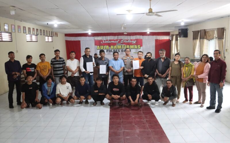 Kepolisian Resor (Polres) Dairi secara resmi menuntaskan konflik antara masyarakat Desa Parbuluan VI, Kecamatan Parbuluan, dengan PT Gruti melalui mekanisme restorative justice. Proses perdamaian tersebut dilaksanakan di Aula Kamtibmas Polres Dairi, Jumat (9/1/2026), sekaligus menandai berakhirnya rangkaian persoalan hukum yang sempat memicu ketegangan sosial di wilayah tersebut.