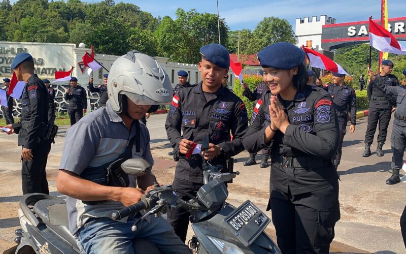 SAMBUT HUT RI KE-80, SATBRIMOB POLDA KEPRI BAGIKAN 1.000 BENDERA MERAH PUTIH