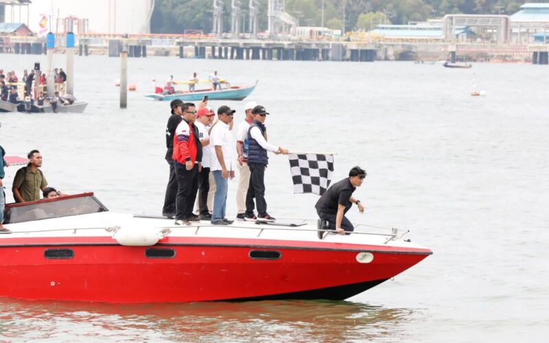 Wali Kota Batam Amsakar Achmad bersama Wakil Wali Kota Li Claudia Chandra memimpin pelepasan peserta Gerindra Cup I, perlombaan laut dalam rangka HUT RI ke-80 yang mempertandingkan kolek layar, speed sport, dan ketinting sport di Dataran Langlang Laut.