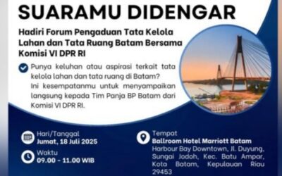 Batam, Vokalpublika.Com – Untuk pertama kalinya, Komisi VI DPR RI membuka forum pengaduan terbuka terkait persoalan tata kelola lahan dan tata ruang di Kota Batam. Forum ini akan digelar pada Jumat, 18 Juli 2025, pukul 09.00 – 11.00 WIB bertempat di Ballroom Hotel Marriott Batam, Harbour Bay Downtown, Sungai Jodoh, Kecamatan Batu Ampar, Kota Batam, …