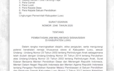 Bupati Luwu, vokalpublika.com – H. Patahudding, resmi menerbitkan Surat Edaran Nomor 2346 Tahun 2025 tentang Pembatasan Jam Malam Bagi Siswa/Siswi di Kabupaten Luwu. Kebijakan ini dikeluarkan untuk meningkatkan disiplin, etika pergaulan, serta mengurangi potensi kenakalan remaja di kalangan pelajar. Dalam surat edaran tersebut dijelaskan bahwa seluruh siswa tingkat SD/MI, SMP/MTs, hingga SMA/SMK/MA atau sederajat dilarang …